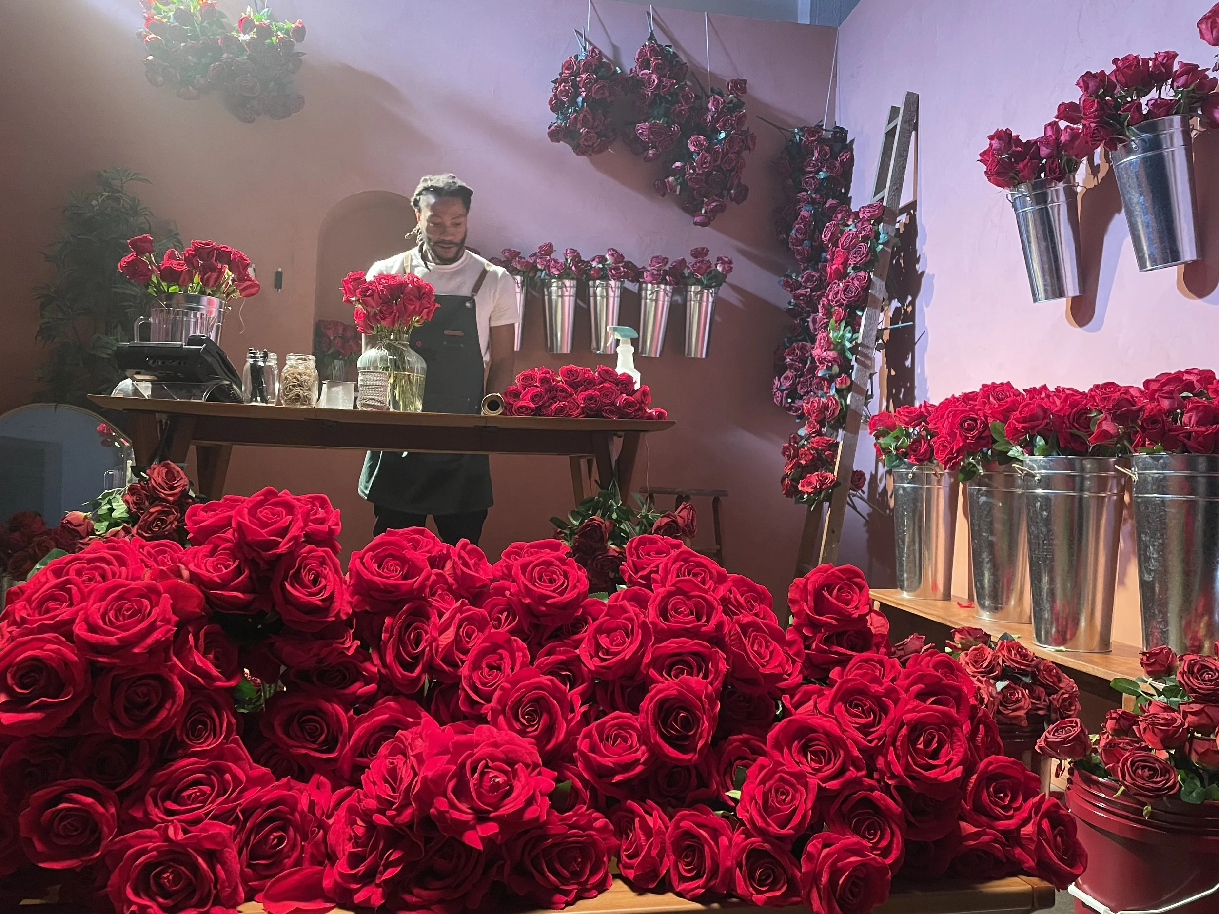 I production designed this for director Carlye Garrick. I built this three wall set on a sound stage. I love flowers, my cousin is a a florist so this was really fun. This is a mix or real and fake flowers. Many of the roses had to be real so Derrick could trim them in the shot.